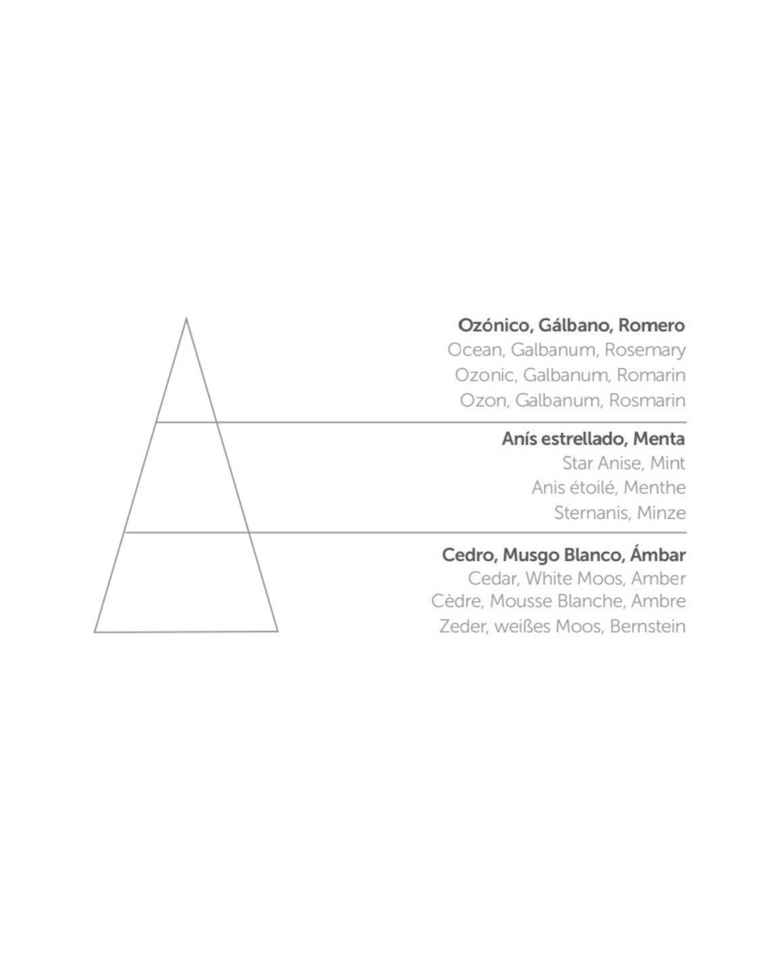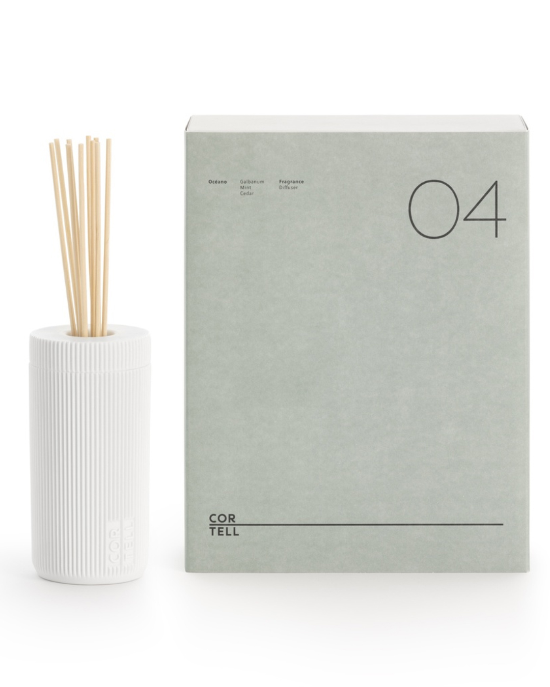 Difusor mikado de cerámica con fragancia 004-Océano, oceánica, verde y amaderada. Notas verdes, como el gálbano y la menta, con un fondo amaderado de cedro y musgo. La caja incluye el recipiente del mikado, varillas y 250ml de fragancia 004-Océano para verter en su interior.