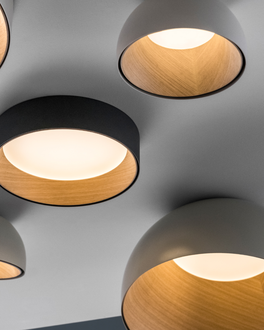 El plafón DUO combina el aspecto natural y cálido de la madera, con la finura técnica del envoltorio metálico.