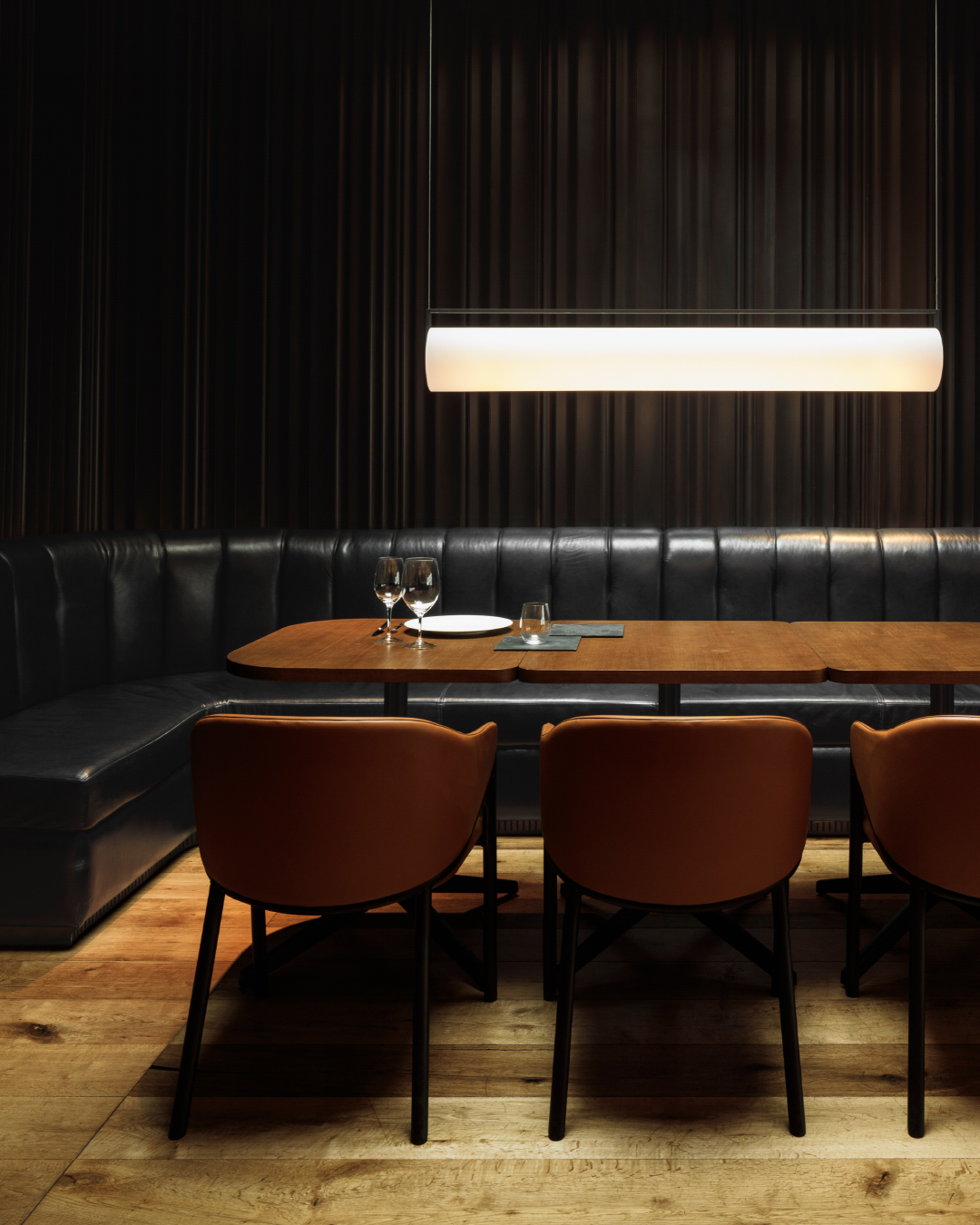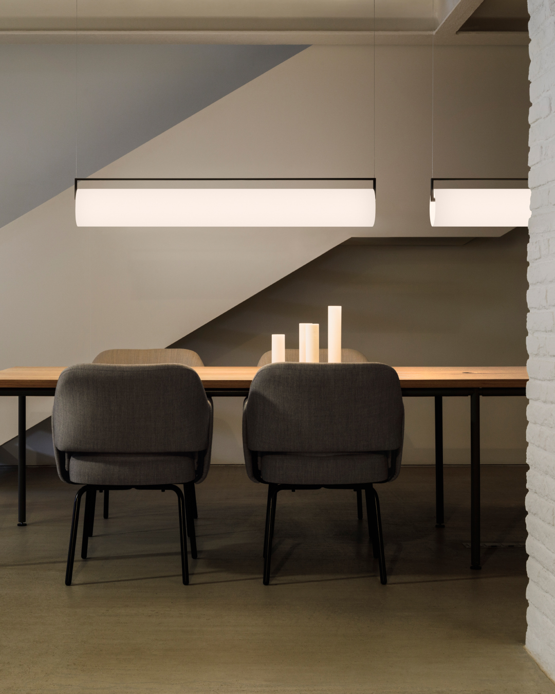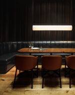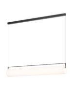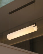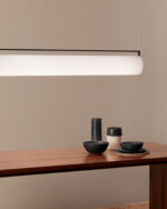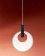 Suspendida de cables prácticamente invisibles, su estructura equipada con LEDs parece flotar en el aire albergando un difusor de vidrio opalino soplado a mano que genera una luz cálida que ilumina 360º.
