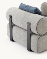 Sofá modular de diseño con formas curvas suaves que contrastan con la estructura metálica que sujeta las piezas.